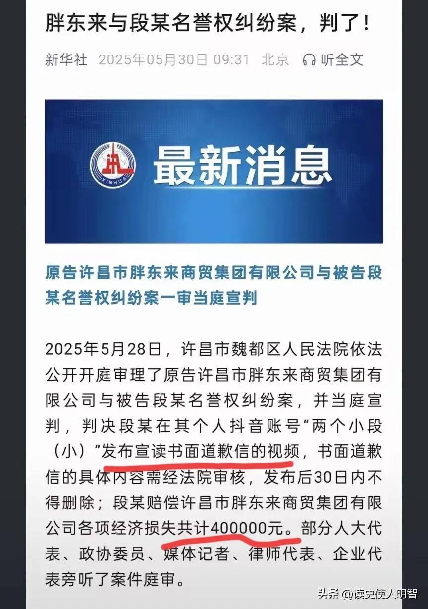 近日,拥有百万粉丝的网红裤头姐因诽谤胖东来而最终迎来了结果——她被判赔偿40万,并且必须发布道歉视频,保留30天,不得删除。这个判决真是让人倍感痛快,相信在这之后,没人再敢随意诽谤胖东来了。